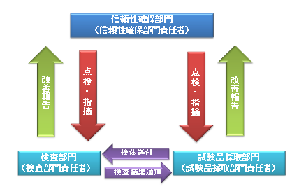 また、信頼性確保部門は、検査部門、試験品採取部門より独立し第三者として定期的に点検を行い、試験検査業務の審査及び指導を行っています。