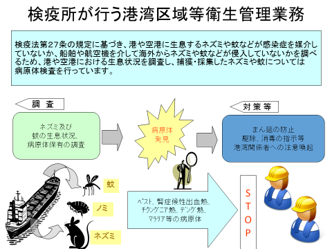 我が国では、検疫法に基づき、海外から来航する船舶や航空機が到着する検疫港や検疫飛行場の衛生状態を明らかにするため、ネズミや蚊などの感染症媒介動物に関する生息調査及び侵入調査を定期的に実施しています。